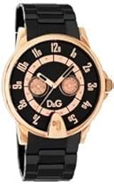 Gold-plated stainless steel case with a black croco-embossed leather bracelet. Fixed gold-plated bezel. Brown dial with gold-tone hands. Minute markers around the outer rim. the d&g logo appears below the 12 o'clock position. Three sub-dials displaying: 60 seconds date and day of the week. Quartz movement. Scratch resistant mineral crystal. Solid case back. Water resistant at 50 meters / 165 feet.