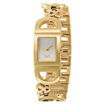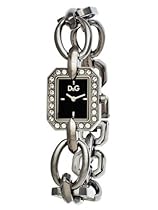 Stainless steel case with a stainless steel bangle bracelet. Fixed stainless steel bezel set with rhinestones. Black dial with silver-tone hands and stick markers at the quarter hour positions. The D&G logo appears at the 12 o'clock position. Japanese quartz movement. Scratch resistant mineral crystal. Steel crown. Solid case back. Case diameter: 21 mm. Case thickness: 7 mm. Jewelry clasp. Water resistant at 30 meters / 100 feet.