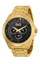 Gold-plated stainless steel case with a gold-plated stainless steel link bracelet. Fixed gold-plated bezel. Brown dial with gold-tone hands. Minute markers around the outer rim. The D&G logo appears below the 12 o'clock position. Three sub-dials displaying: 60 seconds date and day of the week. Quartz movement. Scratch resistant mineral crystal. Textured gold-tone crown. Solid case back. Case diameter: 46 mm. Case thickness: 11 mm. Deployment clasp. Water resistant at 50 meters / 165 feet. Dolce Gabbana Chamonix Mens Watch DW0653.[]