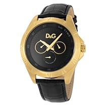 Gold-plated stainless steel case with a black croco-embossed leather bracelet. Fixed gold-plated bezel. Brown dial with gold-tone hands. Minute markers around the outer rim. the d&g logo appears below the 12 o'clock position. Three sub-dials displaying: 60 seconds date and day of the week. Quartz movement. Scratch resistant mineral crystal. Solid case back. Water resistant at 50 meters / 165 feet.
